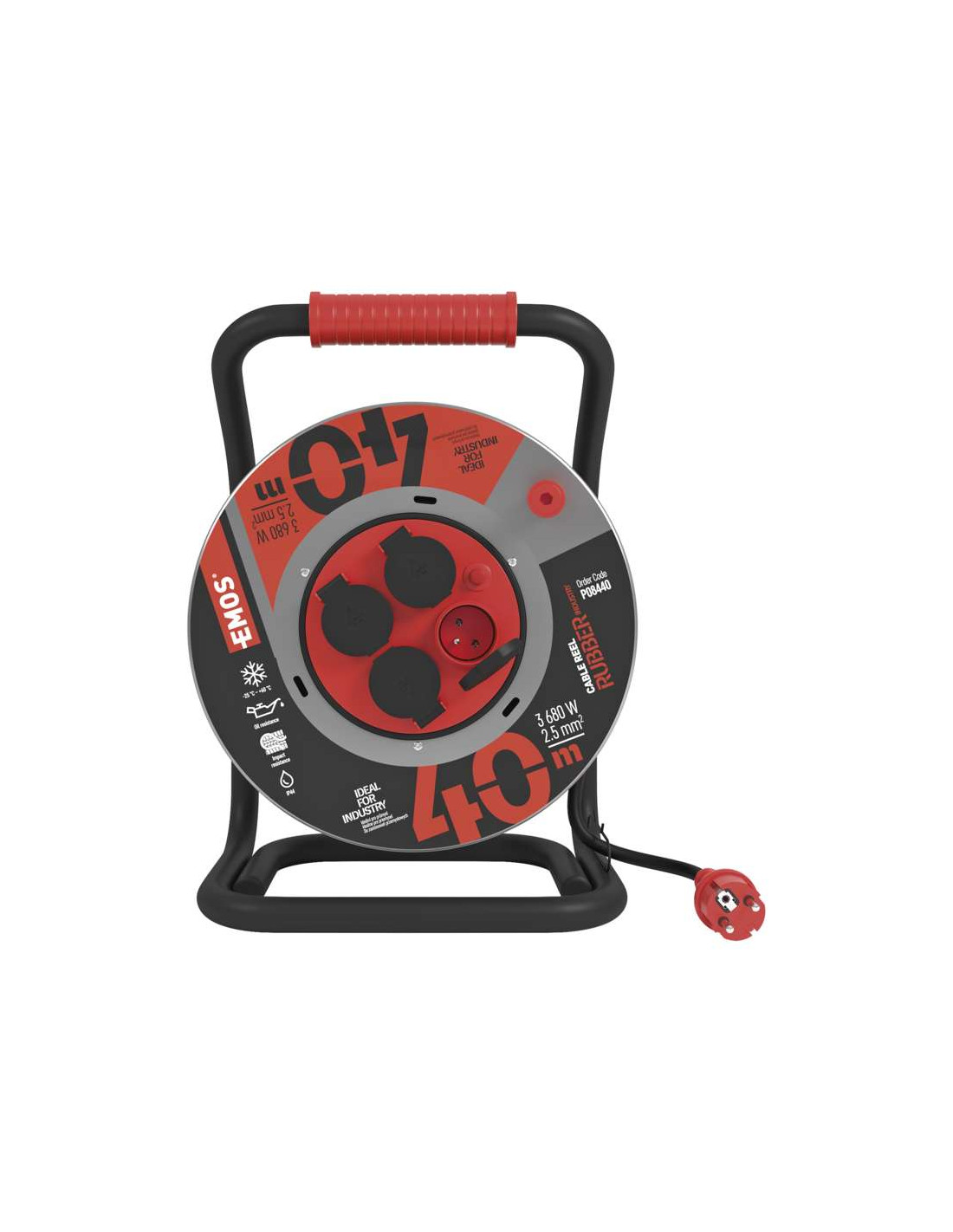 Použitý neoprenový kabel H07RN-F3G 2,5 mm2 lze trvale používat ve venkovním prostředí. Je vysoce odolný proti mechanickému zatížení a olejům. Izolace žil z kaučuku (gumy) a vnější plášť z neoprenu jsou houževnatější než kaučuk (guma). Možnost vyšší zátěže (průřez 3× 2,5 mm2) - svářečky, stavební vrátky, kompresory atd.Počet zásuvek :4 ,krytí IP44 ,zatížení rozvinutého 16 A max./3 680 W , max. zatížení navinutého 5,6 A max./1 300 W.